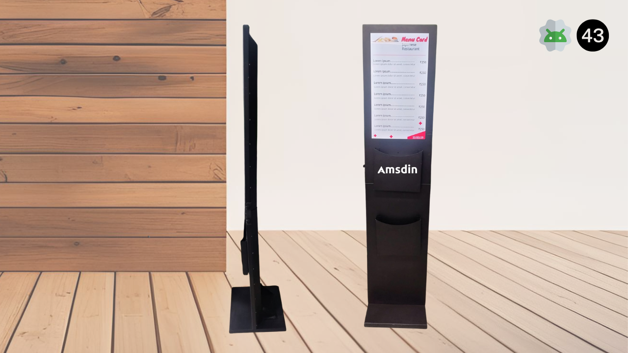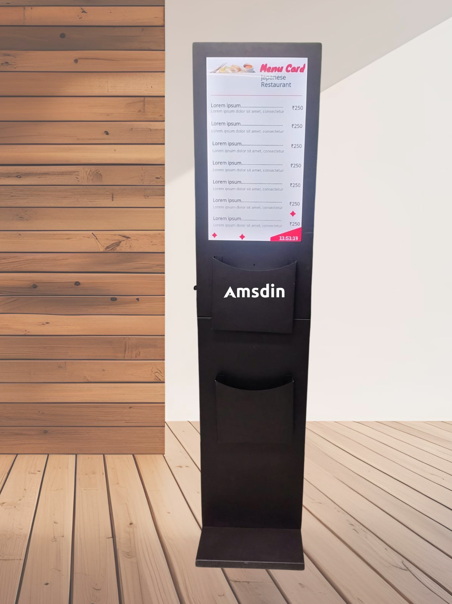Boost retail engagement with a 43-Inch Freestanding Digital Signage with Brochure Holder featuring a built-in leaflet holder – perfect for brochures, offers, and digital ads.